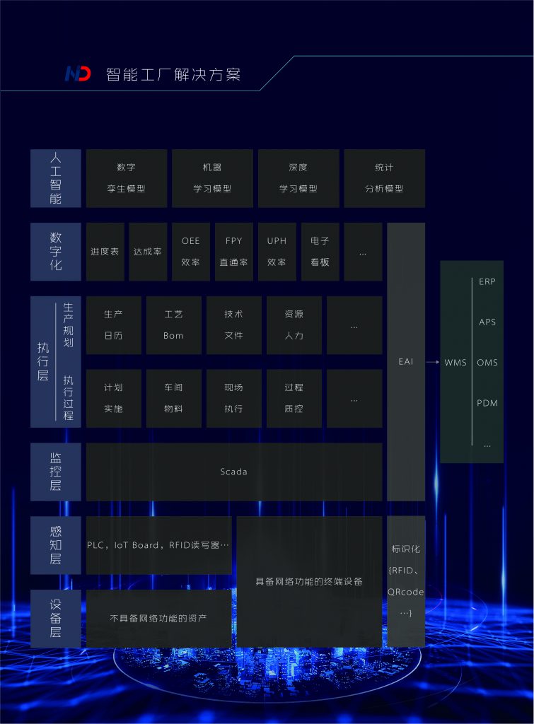 基于 “ 精益管理 ” 和 “ 数据驱动 ” 理念 ,运用物联网、云计算等新一代信息技术为中小型离散型制造企业提供了智能工厂的整体解决方案,覆盖了产品销售、成本核算、生产计划、现场执行、仓储物流、产品运维等环节,实现了企业业务流程的数据感知、实时监控、生产预测和辅助决策,帮助企业分析生产数据,改善业务瓶颈,从而提高企业的生产效率和经营管理水平。